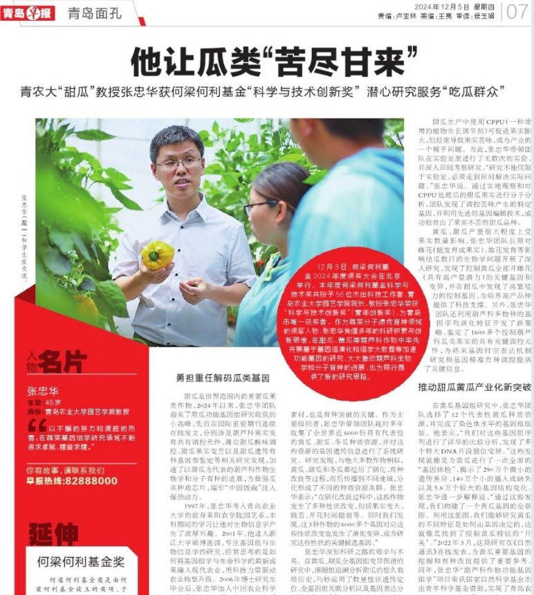 【媒体聚焦】破译瓜类作物“基因密码”!三级片推荐张忠华教授荣获2024年度何梁何利基金奖