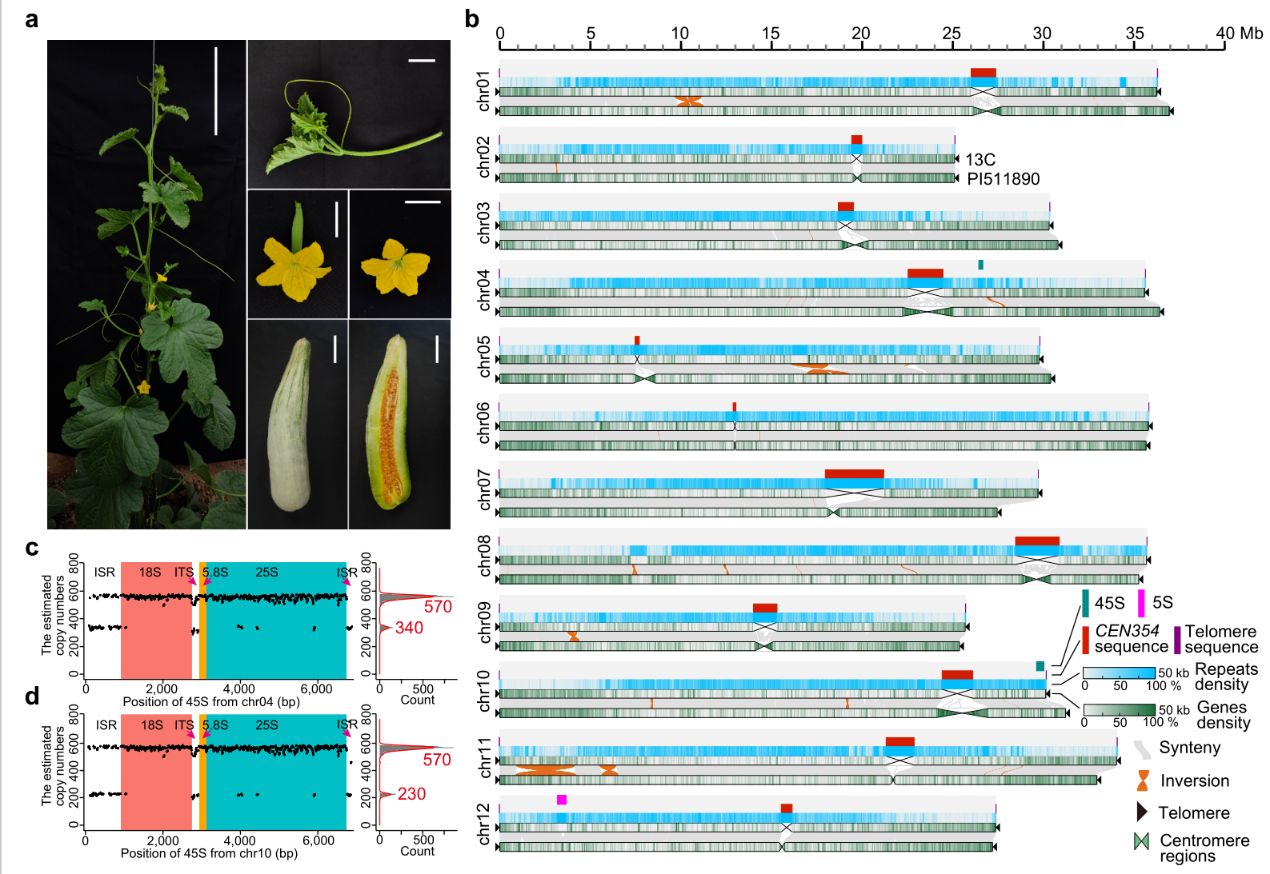 研究团队以优良栽培高代自交系13C为研究对象,利用PacBio HiFi、ONT超长读长和Hi-C等多种测序技术,成功组装出375.64 Mb的高质量端粒到端粒(T2T)甜瓜参考基因组,该基因组包含12个着丝粒和24个端粒,BUSCO完整度高达98.5%。研究团队首次对甜瓜中难以组装的45S rDNA区域进行了准确拷贝数估算,揭示其在栽培型和野生型之间存在显著差异(图1)。