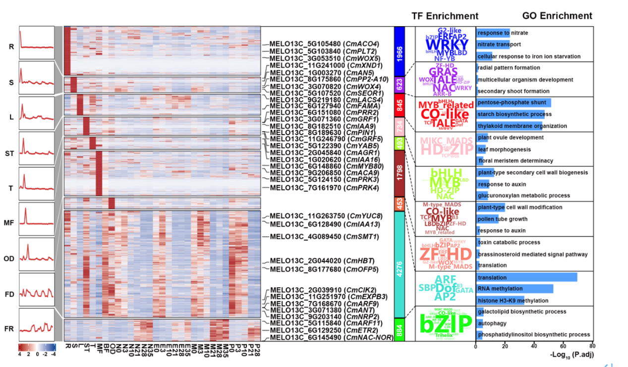 为揭示组织特异表达与果实发育动态,研究团队绘制了覆盖根、茎、叶、花及不同果实时期的31份组织转录图谱。通过基因共表达网络分析,识别出多个组织特异性表达模块并对其转录特征进行解析,同时构建了甜瓜果实成熟过程的转录调控网络,为揭示果实发育中关键生物过程的转录调控机制提供了重要见解(图2)。
