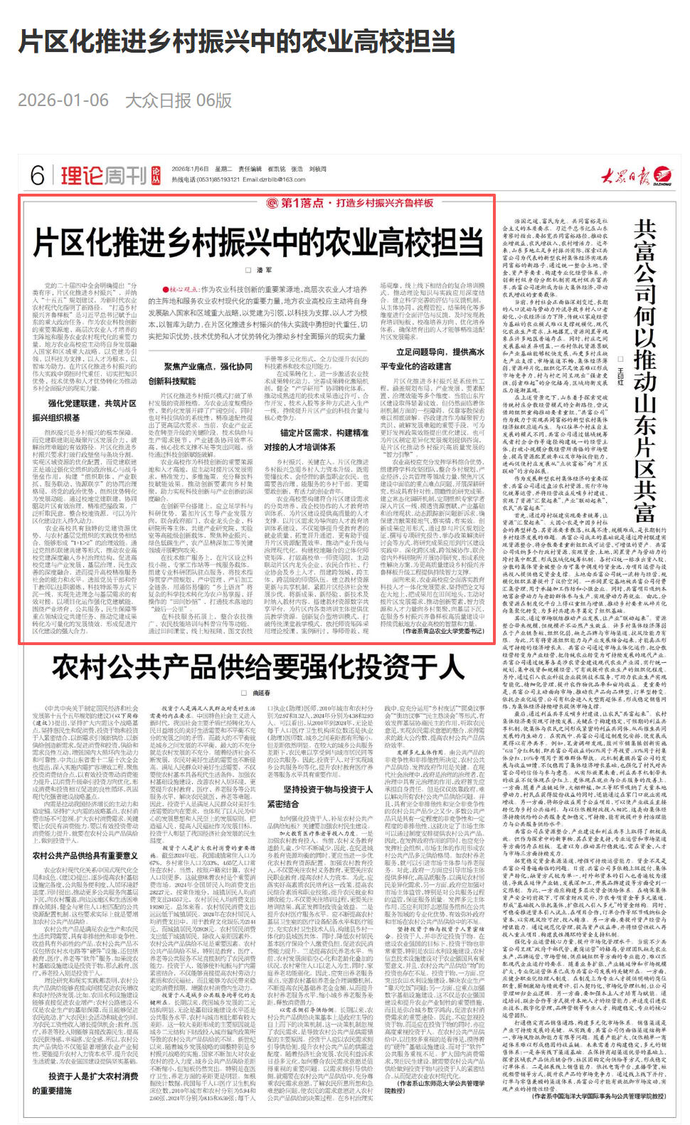 【编者按】近年来,三级片推荐锚定乡村振兴国家战略,全力推进服务山东乡村振兴片区建设。以党建链为引领,有机串联人才链、科技链、产业链,将雄厚的科研学术优势转化为乡村振兴内生动力;依托乡村振兴特色智库,深耕决策咨询领域,持续提升智力支撑“软实力”;组建专家顾问团,下沉片区一线,精准对接需求,为乡村产业发展激活强劲“新动能”,在深化校地融合实践中彰显了服务国家重大战略的使命自觉与创新实践。1 月 6 日,《大众日报》理论版头条以《片区化推进乡村振兴中的农业高校担当》为题,刊发我校党委书记潘军同志署名文章,系统阐述地方农业高校在片区化推进乡村振兴中的责任担当。